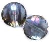 14mm chamfered and cut sparkly crystal disc shaped bead in a beauiful smoky blue grey with a purple AB finish. The threading hole runs across the diameter of the bead. Made in China.