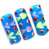 Capri blue glass tube shaped bead decorated with pink and yellow hearts. Available singly or by the string, approx 10 beads per string.