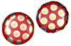 Rich red glass disc shaped bead with silver spot decoration with flashes of turquoise. Quality pressed glass bead made in the Czech republic by Preciosa. The threading hole runs across the diameter of the bead.