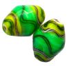Cushioned bicone shaped glass bead with line and wave decoration in shades of green with white highlights. Threading hole along the length of the bead, approx 1mm in diameter. Made in India