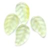 15x9mm pressed glass leaf shaped bead in spring green shades with a threading hole that runs from front to back at the top of the bead.