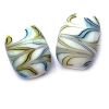 20x15mm cushioned tablet shaped bead made in opaque white glass with a delicate turquoise and lime feathered pattern.