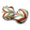 20x15mm cushioned tablet shaped bead made in opaque white glass with a delicate olive and tan feathered pattern.