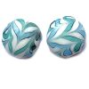 20mm cushioned disc shaped bead made in opaque white glass with a delicate teal and lime feathered pattern.