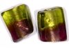 Bicoloured purple and lime twisted rectangular glass bead with a silver lining.