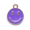 Metal smiley face pendant charm with purple coloured enamelled face.  The charm is approximately 14mm from top to bottom (including the loop) and 12mm wide.