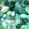 Mixed 100g bag of pressed glass beads in shades of teal - most beads are between 4mm and 10mm in diameter, with a few in each pack up to 20mm in size.