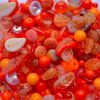 Mixed 100g bag of pressed glass beads in shades of orange - most beads are between 4mm and 10mm in diameter, possibly with a few in each pack up to 20mm in size.