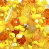 Mixed 100g bag of pressed glass beads in shades of yellow and topaz - most beads are between 4mm and 10mm in diameter, possibly with a few in each pack up to 20mm in size.