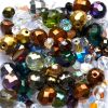 Mixed 100g bag of fire polished faceted glass beads in assorted colours with lustred and iridescent surface finishes. Most beads are between 4mm and 12mm in diameter, with smaller and larger beads up to 20mm in diameter possibly in the mix too.