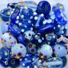 Mixed 200g bag of assorted fancy finish handmade Indian glass beads in shades of blue. Average bead size 14-18mm.