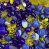 Mixed 100g bag of blue beads with a sprinkling of gold and yellow. Most beads are between 4 and 12mm in diameter but there may be a few smaller or larger than thisw in the mix.